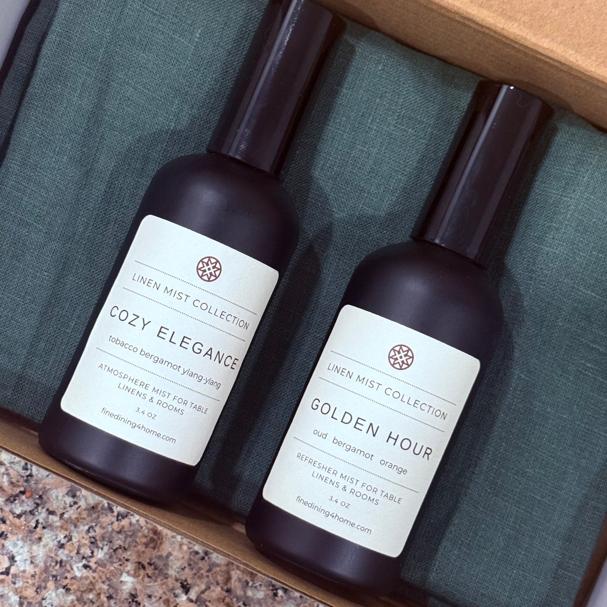 Scent Profile: Oud, bergamot, orange granite accord. Crisp, airy and lightly citrusy with a hint of sunlit sweetness like the light before dinner – a warm, elegant mist to uplift your linens and space.